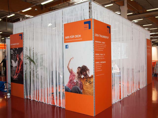 Hier ein Beispiel der macromedia Akademie, welche das System mit selbstgestalteten Grafiken als Informationswand neben dem eigentlichen Standbau verwand haben: